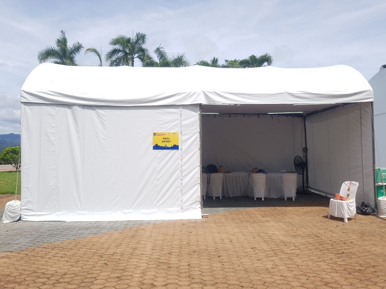 เต็นท์สำหรับพักชั่วคราว พร้อมประตูเข้าออก ผ้าใบกันสาด รางรองน้ำ ฝ่าเพดานผ้าใบ พร้อมแอร์เคลื่อนที่ และพัดลมสนาม เหมาะสำหรับทำเป็นที่พักเพื่อรองรับแขกคนสำคัญ เช่น นักการเมือง ผู้ว่าราชการจังหวัด นักกีฬา นักแสดง นักท่องเที่ยว ในสถานที่ ห่างไกลจากห้องพัก รีสอร์ท โรงแรม